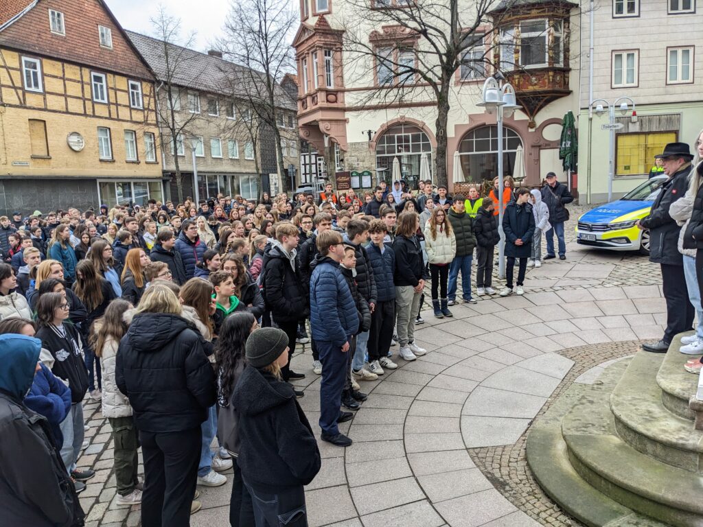 Trauermarsch als Zeichen für Solidarität – Mehr als 200 Schülerinnen und Schüler der weiterführenden Schulen Alfelds versammelten sich am 24. Februar, dem Jahrestag des Krieges Russlands gegen die Ukraine, auf dem Marktplatz.