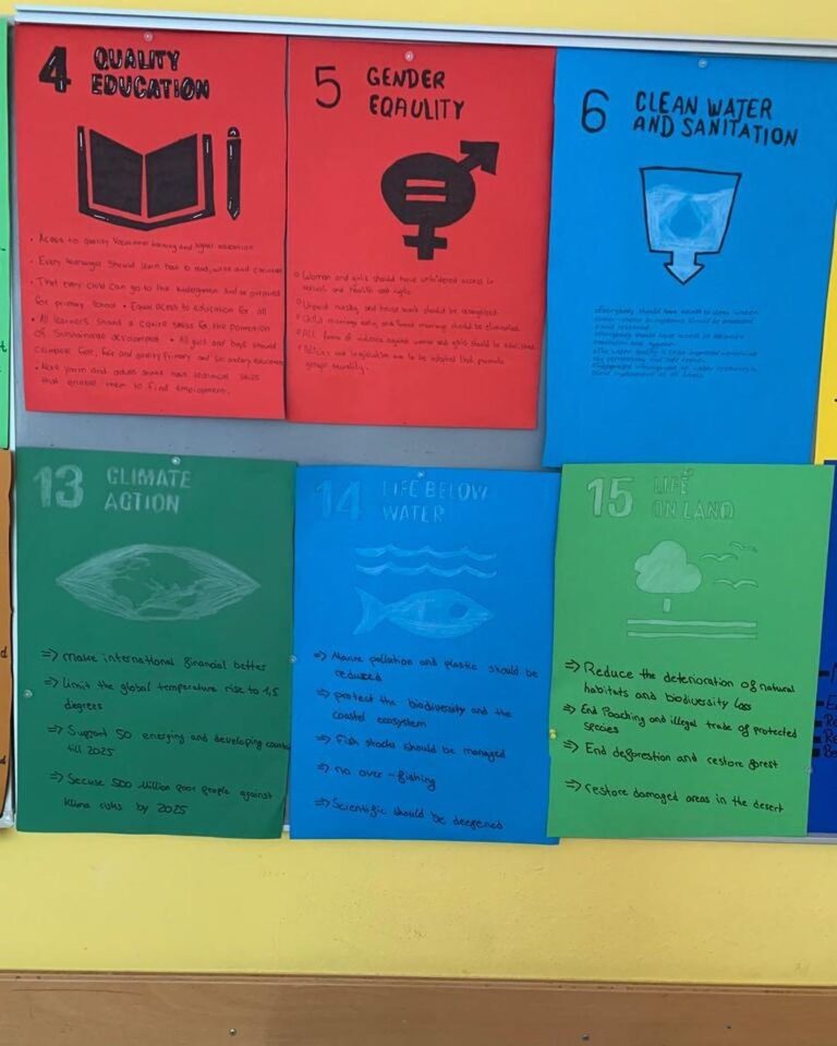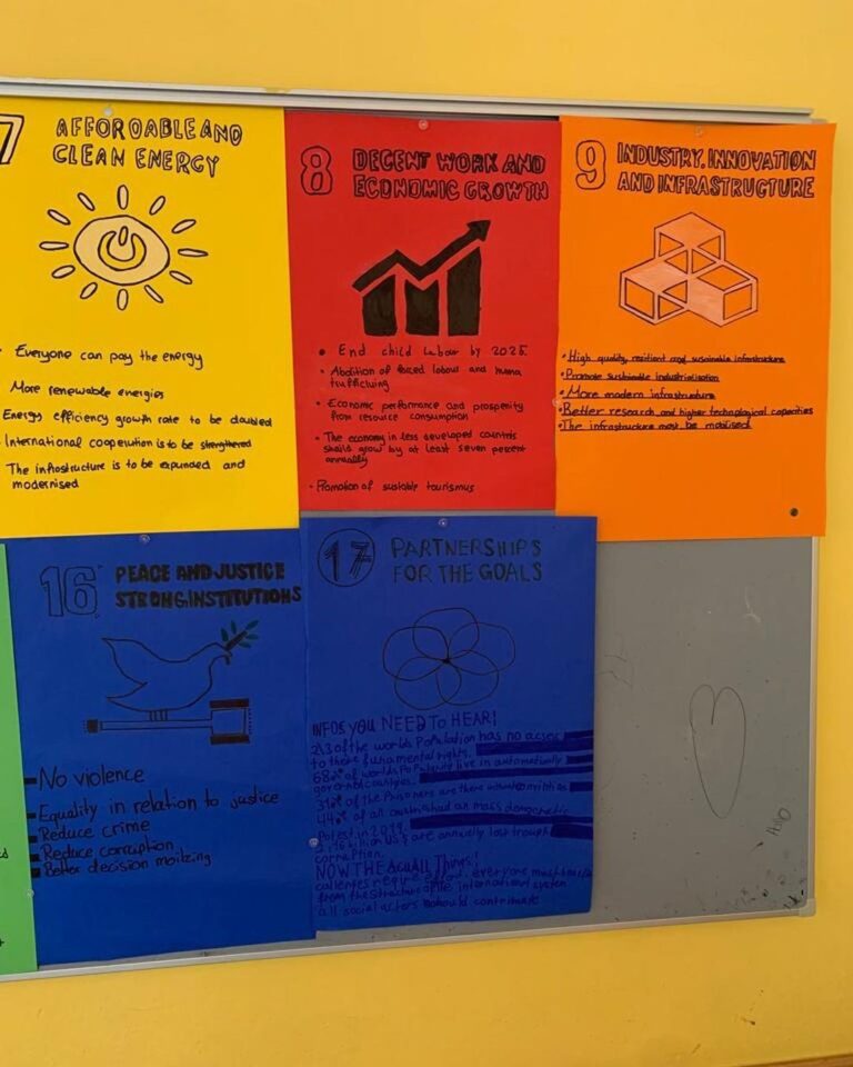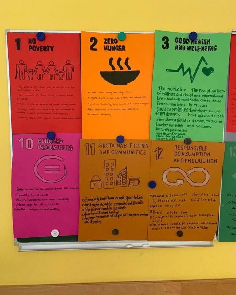 In dieser Woche beschäftigen wir uns mit dem Thema Nachhaltigkeit – auf Englisch! Gemeinsam schauen wir uns einige der 17 Entwicklungsziele für nachhaltige Entwicklung der Vereinten Nationen an. So kreieren wir bspw. eine Fotocollage eures Lebensmittelverbrauchs und entwickeln Handlungsmöglichkeiten gegen Lebensmittelverschwendung, beschäftigen uns mit dem Plastikproblem unserer Erde, eurem persönlichen ökologischen Fußabdruck oder vergleichen euren Alltag mit Kindern auf der ganzen Welt.