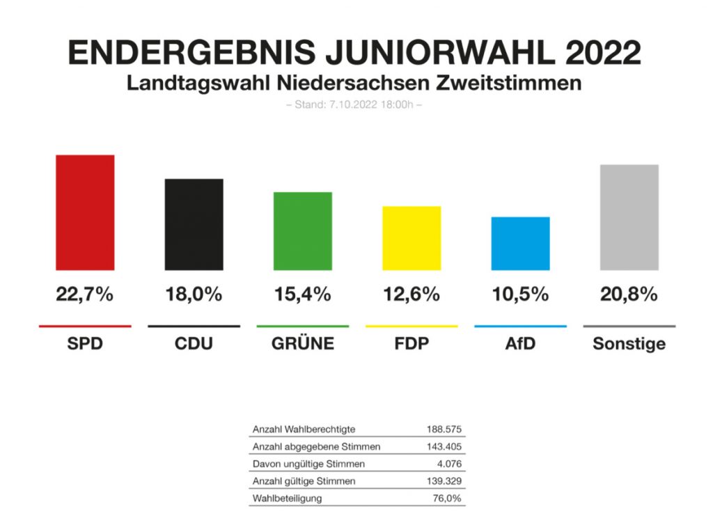 Das Endergebnis aller Schulen, die sich in Niedersachsen an der Juniorwahl beteiligt haben, wurde zeitgleich mit den ersten Prognosen am 09.10.2022 um 18.00 Uhr veröffentlicht.